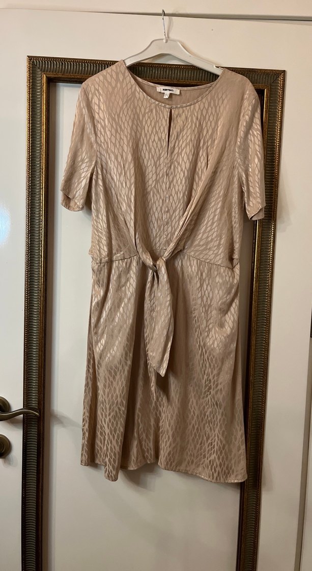 Bej renkli midi boy, yılan desenli, bol kesim kadın elbise. İnce askılı kollar ve belden bağlama detayı bulunur. Modern Paris tarzı.