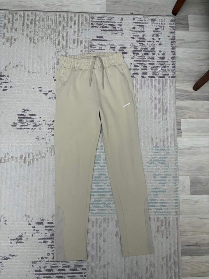 Bej renkte, midi boyda, regular fit kadın eşofman altı. Yumuşak sentetik kumaştan, rahat ve şık sokak stili için uygundur.