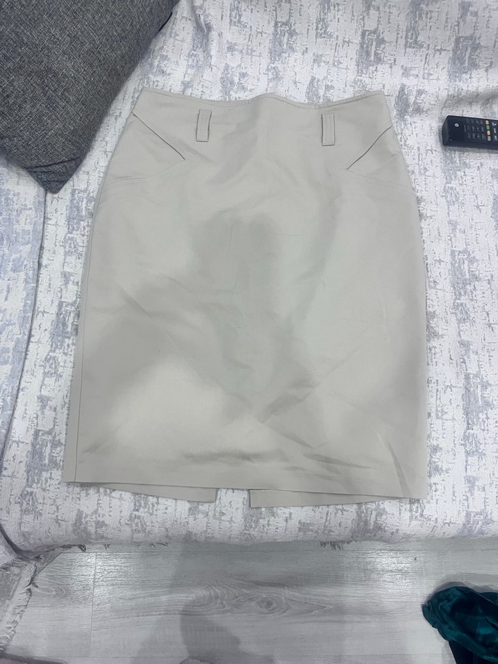Bej renkte ve normal uzunlukta kadın midi eteği. Düz ve sade tasarımıyla ofis ve günlük şıklık için uygundur.