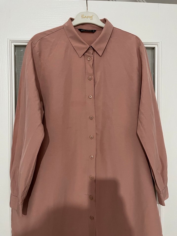 Bej renkte, yakalı ve uzun kollu midi gömlek. Düğmeli, bol kesim ve ipeksi dokuda olup ofis için minimal ve normcore tarzda uygundur. Pastel tonlarda ve desensizdir. Askıda "SARE" yazısı görülmektedir.