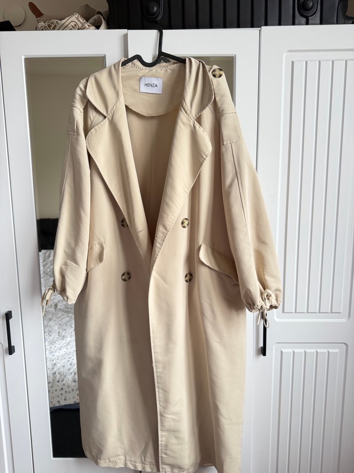 Bej renkte, keten kumaştan midi uzunlukta, düğmeli ve uzun kollu, geniş kesim kadın trençkot.kemeri mevcuttur