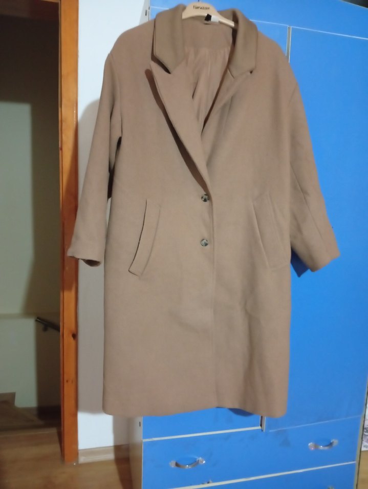 İki koltuk arası 63 cm Boy 103 cm,Bej renkli, düğmeli midi kaban, normal kesim ve uzun kolludur. Yumuşak ve sıcak kumaştan üretilmiş, minimalist normcore tarzına uygundur. Yurtdışından alındı herhangi bir kusuru yok ( etiket bedeni M yazıyor fakat yurtdışında bedenler farklı 48 beden olarak giyildi