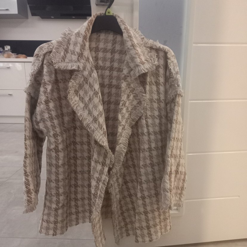 Bej renkli, düğmeli ve uzun kollu kadın kabanı. Normal kesim ve midi boyda, yumuşak sentetik kumaştan, ince kare desenli, günlük sokak tarzına uygun.