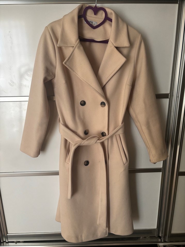 Bej midi uzunlukta, çift düğmeli ve kemerli kadın kabanı. Rahat kesim, yumuşak ve sıcak kumaştan, ofis ve günlük kullanım için uygundur.