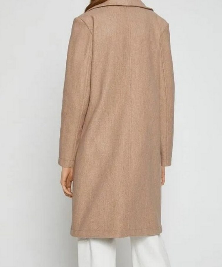 Bej midi uzunlukta, düğmeli, uzun kollu kadın kabanı. Yumuşak ve sıcak dokulu kumaştan, minimalist ve desensiz tasarım, günlük kullanım için uygundur.