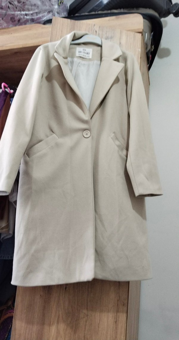Bej renkte, düğmeli notched lapel yakalı midi kadın kaban. Uzun kollu, rahat kesim ve yumuşak sentetik kumaştan üretilmiştir. Kuru Temizleme Yapılmıştır.