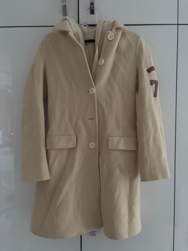 Bej renkte, düğmeli ve kapüşonlu midi uzunlukta kadın kabanı. Yumuşak ve sıcak kumaştan, uzun kollu, düzenli kesim ve günlük sokak stili için uygun. Paketledigim icin kırışmış.