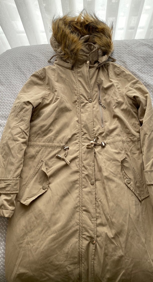 Bej midi uzunlukta kadın kaban, kürklü kapüşon ve uzun kollu. Keten kumaştan, kesimi bol ve dış mekan kullanıma uygun.