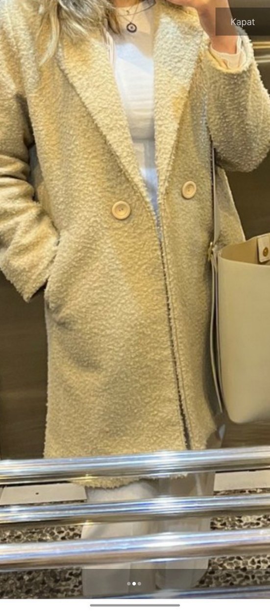 Bej midi uzunlukta kadın kaban, kesik yaka ve peluş detaylıdır. Yumuşak ve sıcak kumaştan yapılmış, rahat kesim ve uzun kolludur, günlük sokak stiline uygundur.