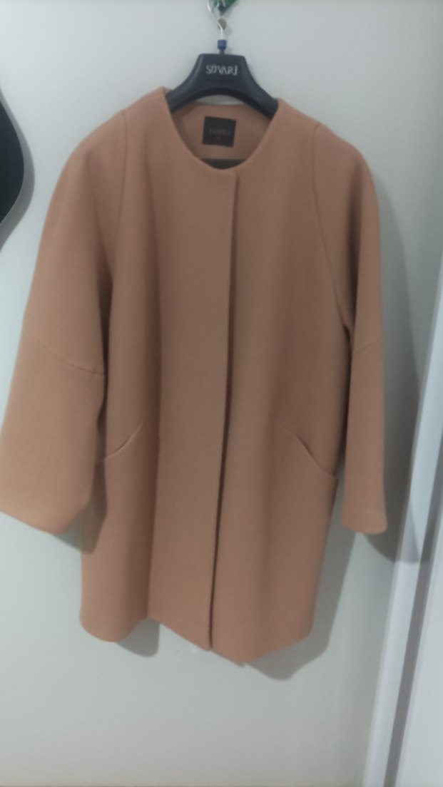 Yuvarlak yakalı, uzun kollu, rahat kesim bej kaban. Minimalist ve desensiz tasarımıyla günlük kullanıma uygun, yumuşak dokulu kumaşa sahip.