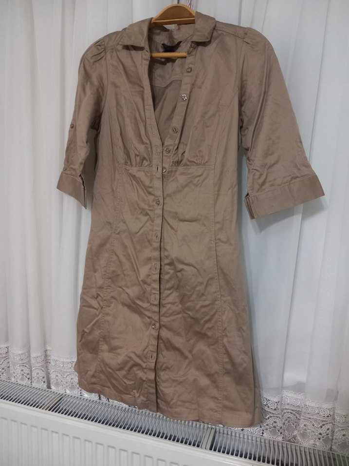 Bej renkte, keten kumaştan yapılmış midi uzunlukta kadın ceketi. Kısa kollu, düğmeli ve notlu yaka detaylıdır. Rahat ve bol kesimdir, günlük sokak stili için uygundur.