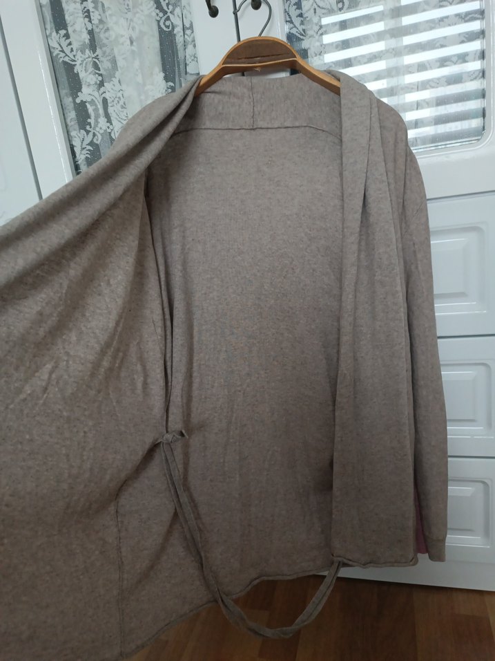 Bej renk, keten kumaştan, salaş kesim midi uzunlukta kadın hırkası. Notlu yakası ve uzun kolları ile rahat ve bohem tarzda, günlük kullanıma uygun.