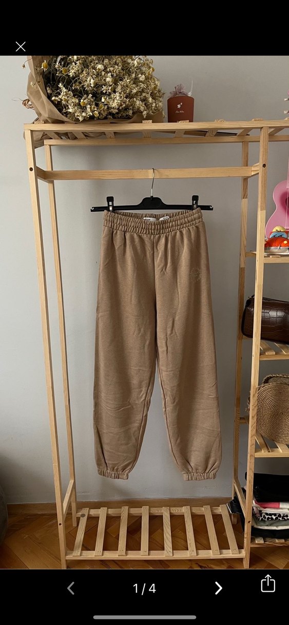 Yumuşak keten kumaştan yapılmış bej midi uzunluğunda, bol kesim ve elastik manşetli rahat kadın sweatpants. Günlük kullanım için şık ve rahat bir seçim.