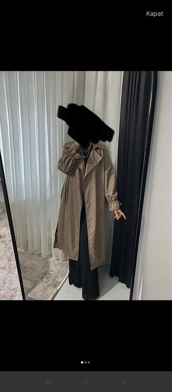 Bej renkli midi uzunlukta keten trençkot, bol kesim ve drapeli detaylara sahiptir. Uzun kollu, yaka tipi açık yaka olup minimal sokak stili sunar.