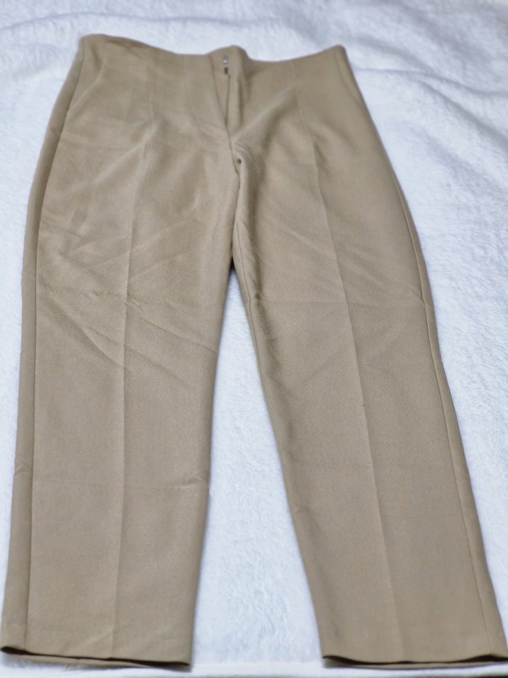 Düz bej renkli, normal boy midi kadın kumaş pantolon. Rahat kesim, yumuşak sentetik kumaştan, minimalist ve sade tarzda, ofis için uygun, pastel tonlu. Sıfır hiç giyilmemiştir.