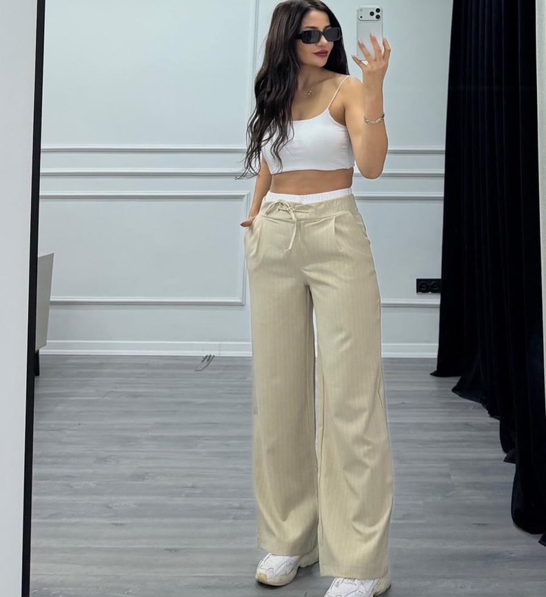 Bej renkli, midi boy, regular fit kadın kumaş pantolon. Rahat kullanım için bağcıklı bel ve yumuşak sentetik kumaş kullanılmıştır. Bedenleri mevcuttur