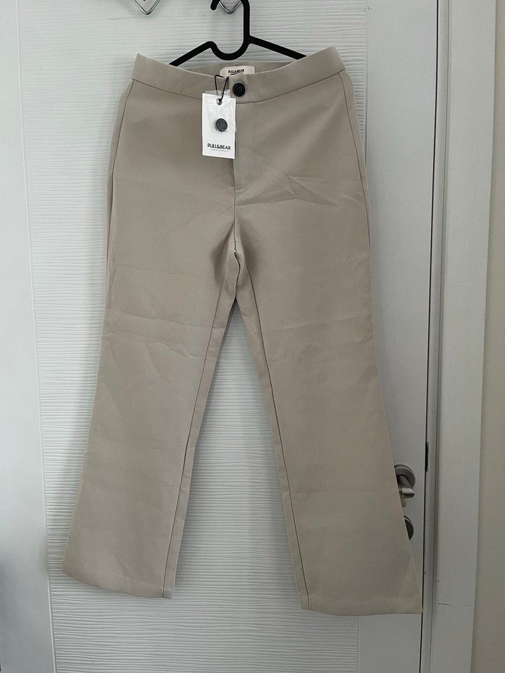 Bej renkte, normal boy midi kadın kumaş pantolon. Rahat kesimi ve düz deseniyle günlük sokak stiline uygun.
