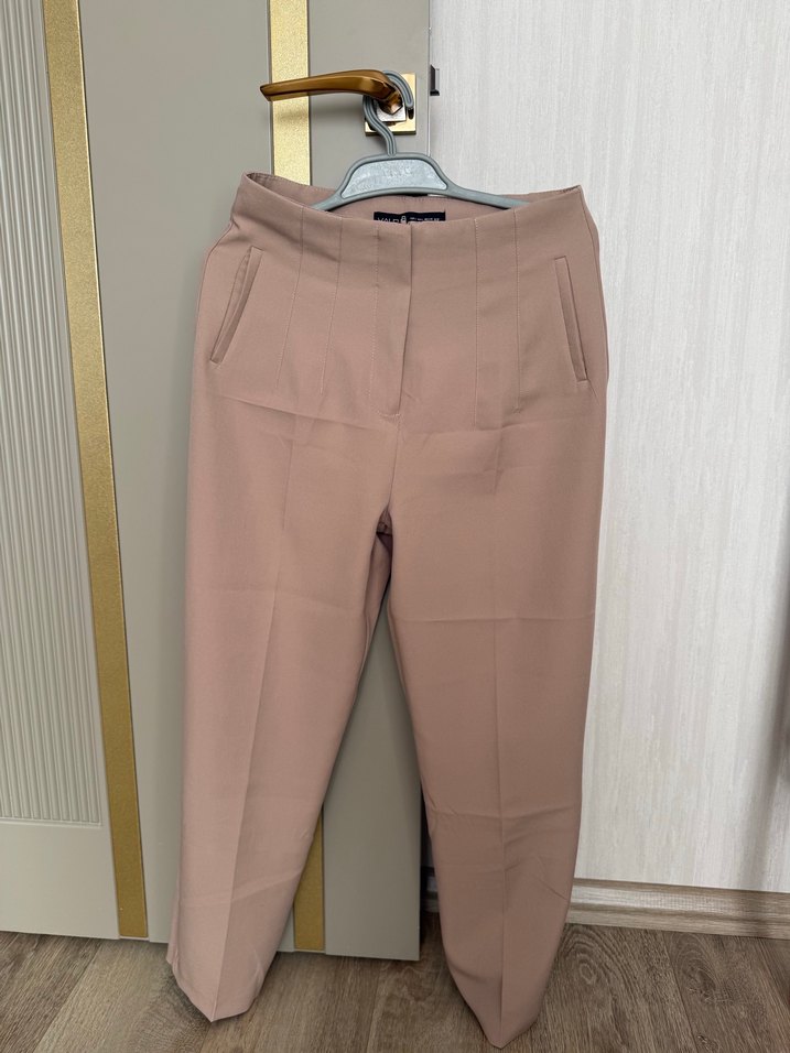 Bej midi uzunlukta, regular fit kadın kumaş pantolon. Düz ve desen içermeyen, sentetik kumaştan, ofis için şık ve rahat bir seçim. Yan ceplidir.