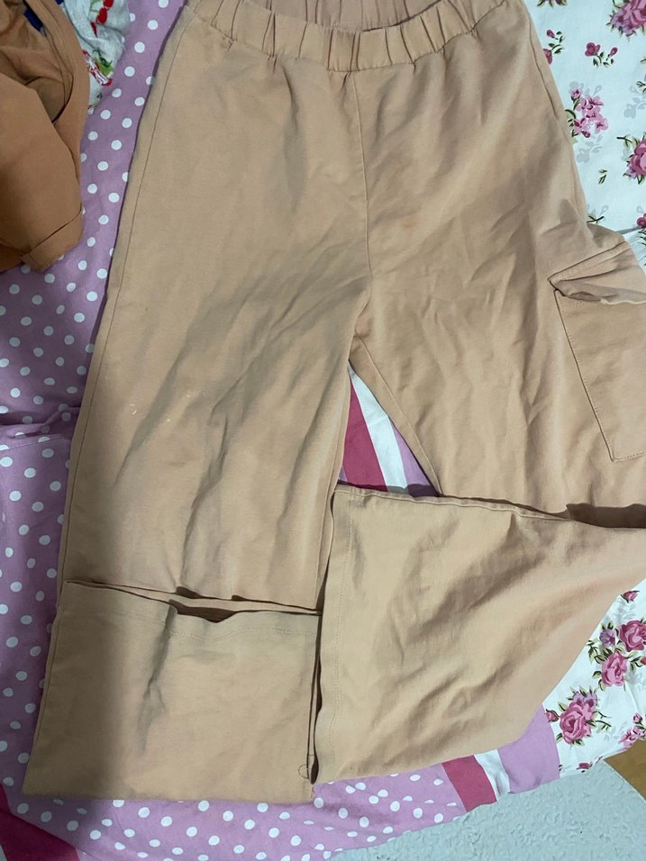 Bej renkli, midi boyda, bol kesim kadın kumaş pantolon, yanlarda yırtmaç detaylı, yumuşak sentetik kumaştan üretilmiştir. Rahat sokak stili için uygundur.