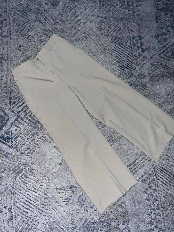 Bej renkte, midi boyda, regular fit kadın kumaş pantolon. Düz ve yumuşak sentetik kumaştan, ofis için şık ve rahat bir tarz sunar. Hic giyilmedi etiketi yok kusuru yoktur