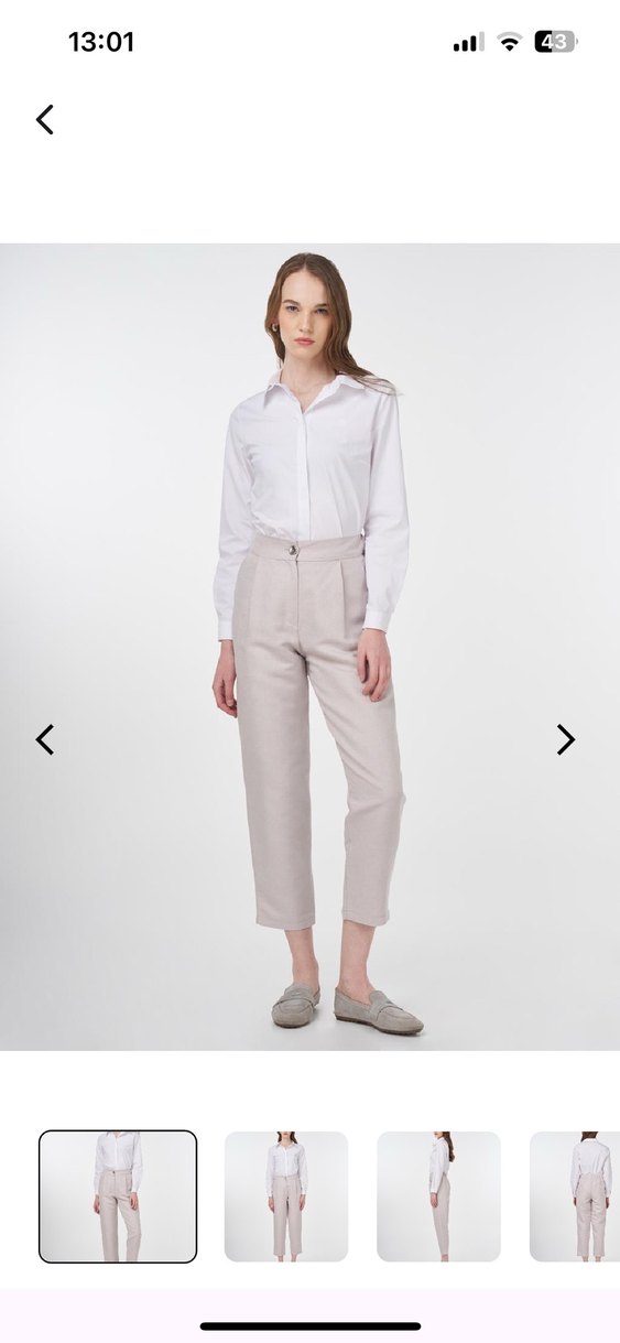 Bej renkli, midi boy, regular fit pamuk kumaş pantolon. Desensiz ve ofis için şık, zahmetsiz bir görünüm sunar. Online’dan aldım bana çok bol oldu iade süresi geçtiği için uyguna koydum