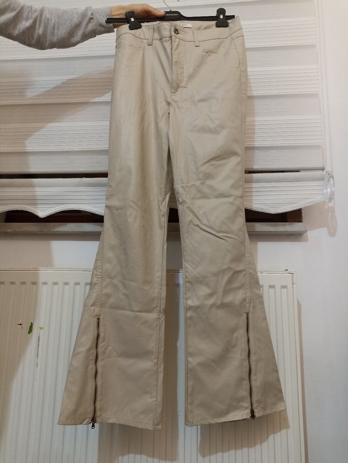 Bej renkli, midi boy, regular fit kadın kumaş pantolon. Sentetik kumaştan üretilmiş, paçalarında fermuar detayları bulunur. Günlük sokak stili için uygundur.