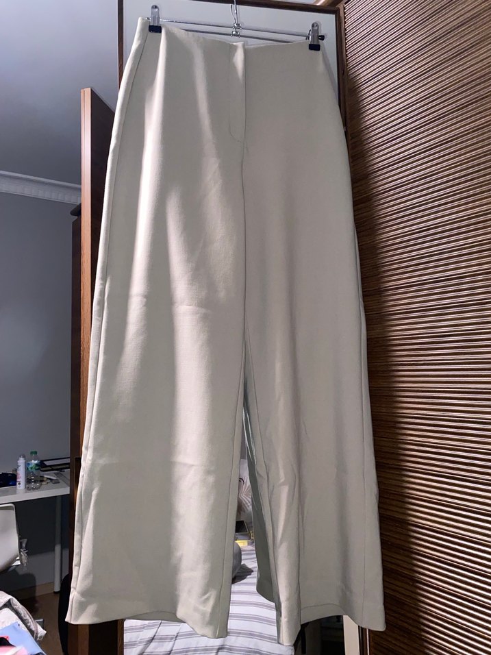 Bej renkte, midi boy, regular fit ve drapeli tasarıma sahip kadın kumaş pantolon. Minimalist ve ofis stiline uygun rahat bir modeldir.