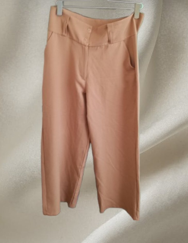 44 beden,Bej renkte, midi boyda, regular fit kadın kumaş pantolon. Düz, pürüzsüz sentetik kumaştan, günlük rahat kullanıma uygun minimal sokak stili.