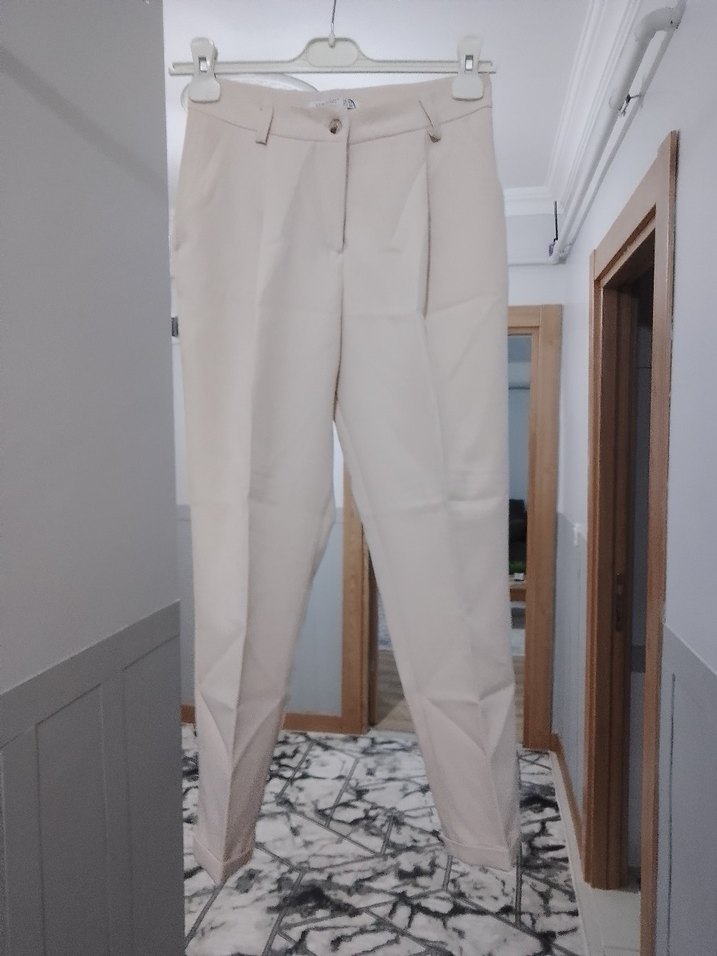 Bej midi uzunlukta, regular fit kesim ve düz sentetik kumaştan yapılmış, ofis için şık ve rahat kadın pantolonu 46 beden yazıyor fakat 40 42 bedene ancak olur kalıbı küçük sıfır hiç kullanılmadı.