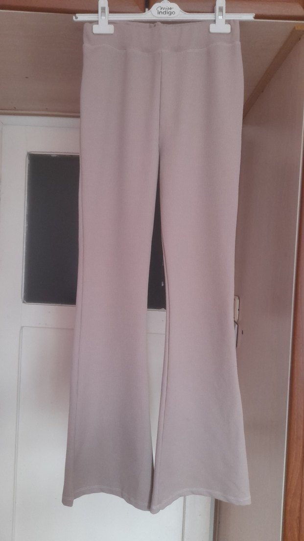 Bej midi uzunlukta, düz kesim kadın kumaş pantolon. Yumuşak sentetik kumaştan, minimalist ve normcore tarzda, günlük kullanıma uygun.