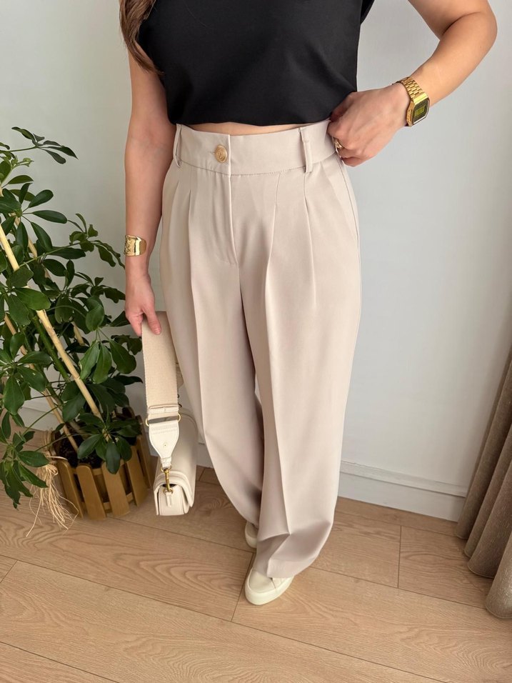 Bej midi uzunlukta, regular fit kadın kumaş pantolon. Pürüzsüz sentetik kumaştan, günlük kullanıma uygun, zahmetsiz şıklık sunar. Hiç giyilmedi etiketi vardı ama çıkardım S beden naylon kumaş fln değil boyu 105 cm