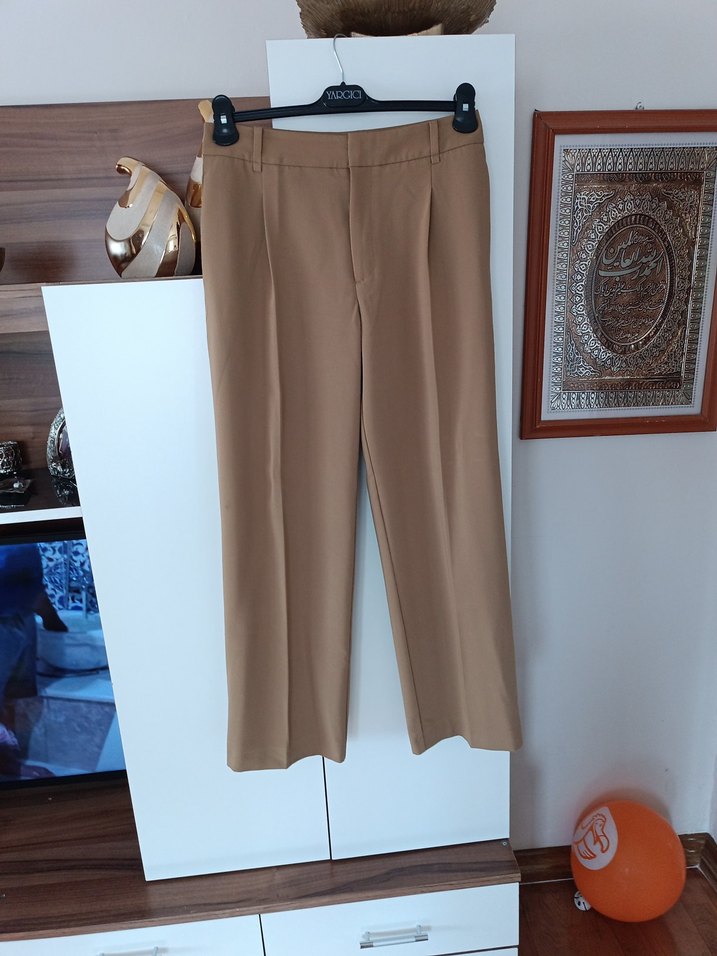 Bej renkli, midi boy, düz kesim kadın kumaş pantolon. Sentetik kumaştan üretilmiş olup iş ortamına uygun sade ve şık bir görünüme sahiptir.
