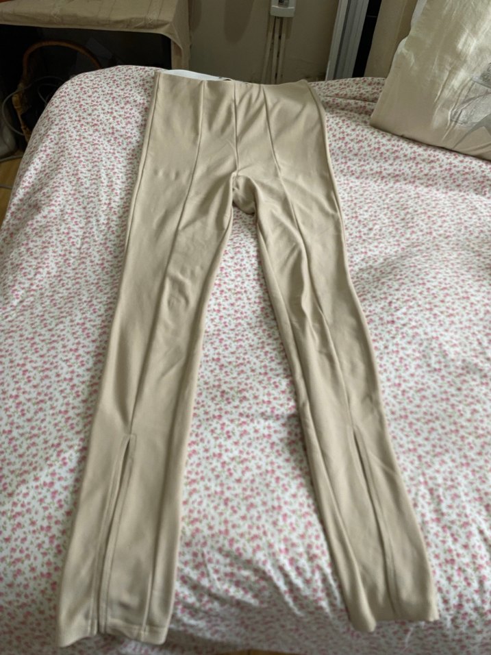 Bej renkte, midi boyda ve yırtmaç detaylı, ince dokulu sentetik kumaştan yapılmış kadın kumaş pantolon. Rahat ve şık sokak stili için uygun.