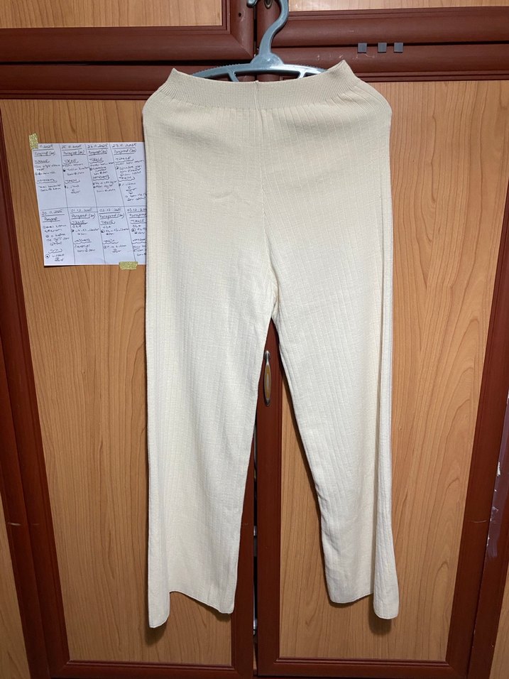 Bej midi boy kadın pantolon, regular fit ve pile detaylıdır. Yumuşak sentetik kumaştan üretilmiştir, gündelik kullanıma uygundur.