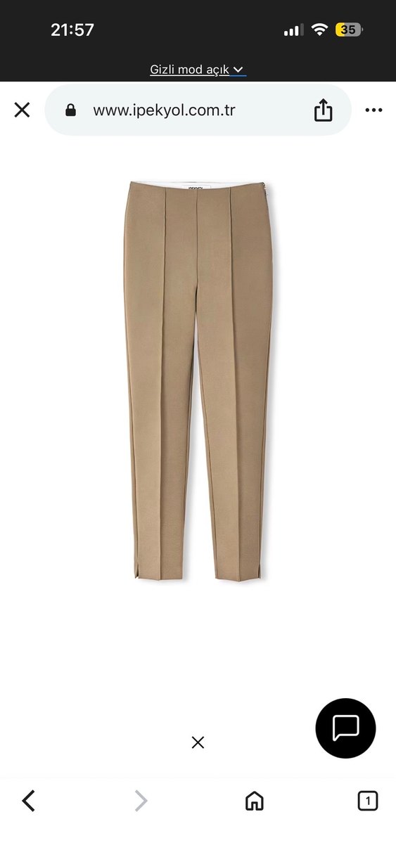 Bej midi uzunlukta, düz kesim ve minimalist tasarıma sahip kadın kumaş pantolon. Pürüzsüz sentetik kumaştan üretilmiş, ofis için uygun, sade ve çağdaş tarzda.