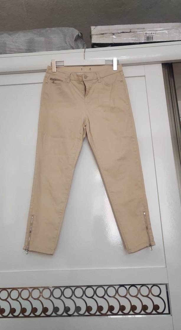 Bej renkli, midi boy, regular fit kadın kumaş pantolon. Fermuarlı detaylara sahip, yumuşak sentetik kumaştan üretilmiştir. Günlük ve sokak stiline uygundur. ✨