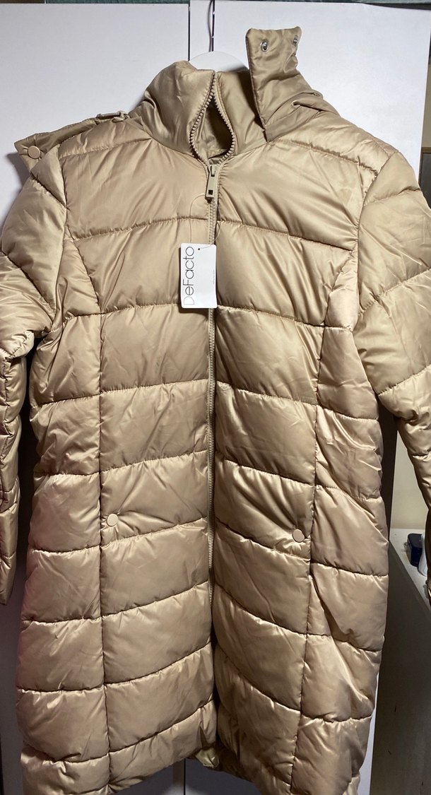Bej renk, fermuarlı, uzun kollu, normal boy midi kadın mont. Yumuşak sentetik kumaştan, sade ve rahat sokak stili için uygun.