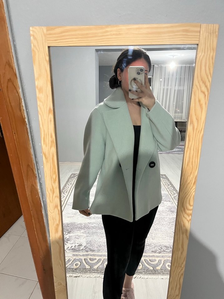 Bej renkli, orta boy kadın kabanı, kesik yaka ve uzun kolludur. Düzenli kesim, düğmeli kapama ve yumuşak, sıcak kumaştan üretilmiştir. Ofis için uygundur.
