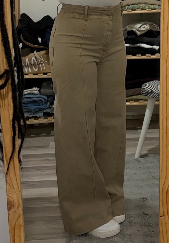Bej midi boy kadın pantolon, rahat kesim ve sentetik kumaştan. Günlük sokak stili için zahmetsiz şıklık sunar.