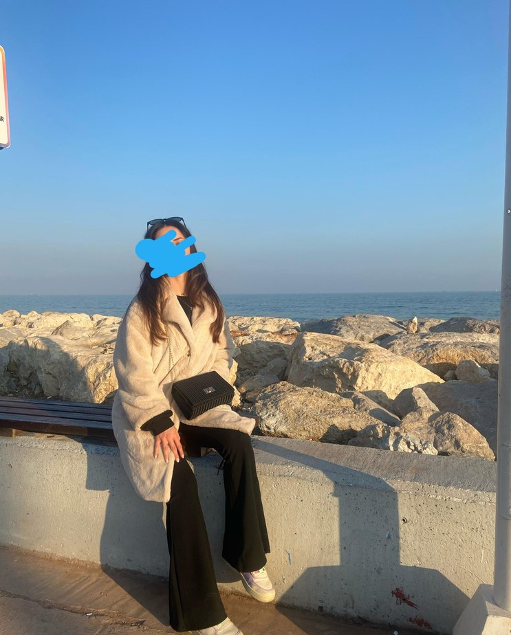 Bej renkli, peluş kumaştan yapılmış midi boy kaban. Yakası kesik ve bol kesimdir. Uzun kollu ve kemerli, rahat ve gündelik tarz için uygundur.