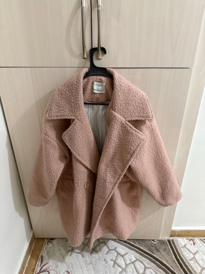 Yumuşak peluş kumaştan yapılmış, toz pembe renkli, midi boy ve bol kesim kaban. Yaka detaylı, uzun kollu ve desensiz, rahat kullanıma uygun bir modeldir. Temiz kusursuz