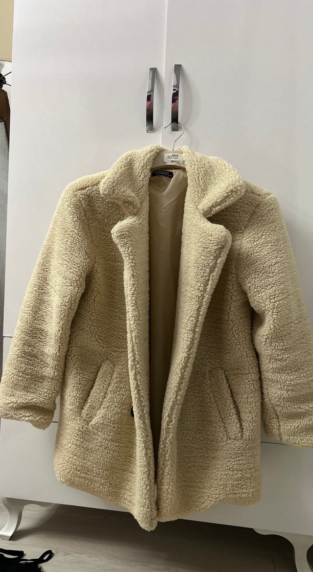 Bej renkte, peluş kumaştan yapılmış, kürk detaylı, normal uzunlukta midi kaban. Notch yaka ve uzun kolludur, rahat kesimiyle günlük kullanıma uygundur.