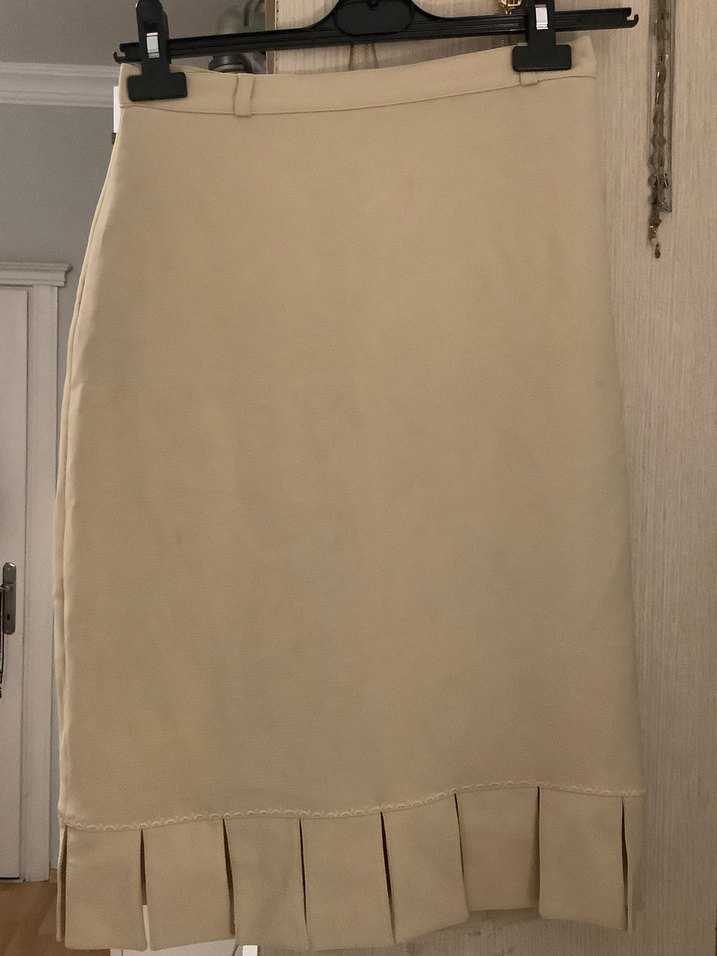 Bej rengi midi uzunlukta, pilili etek. Düz ve regular fit, sentetik kumaştan üretilmiş. Ofis için uygun, sade ve Normcore tarzda.