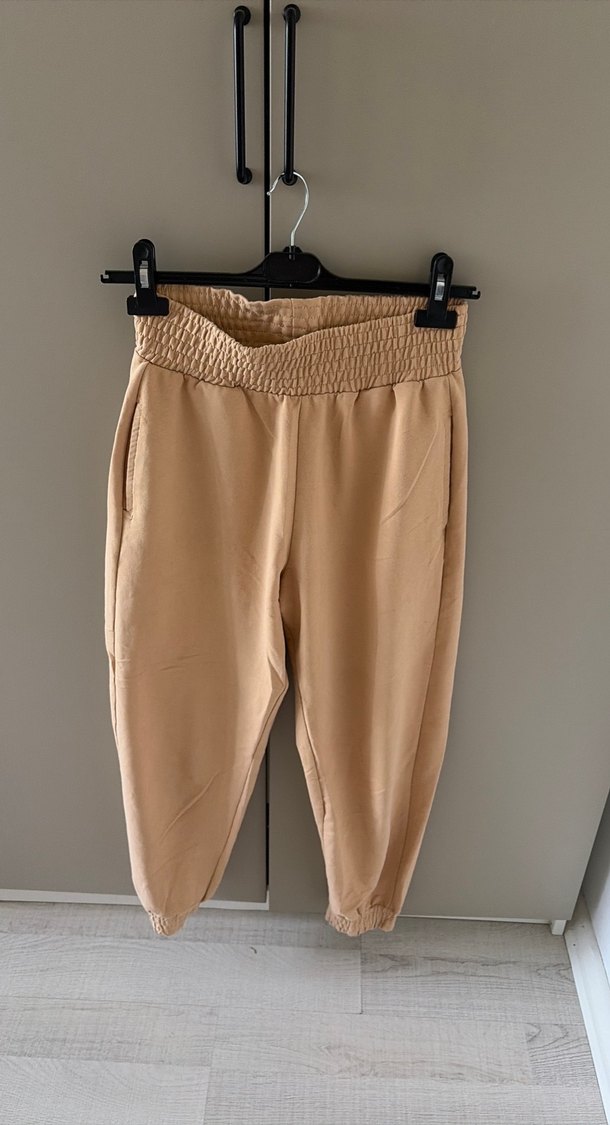 Bej midi boy keten kumaştan, rahat kesim ve lastikli bel detaylı kadın eşofmanı, günlük kullanım için uygundur.