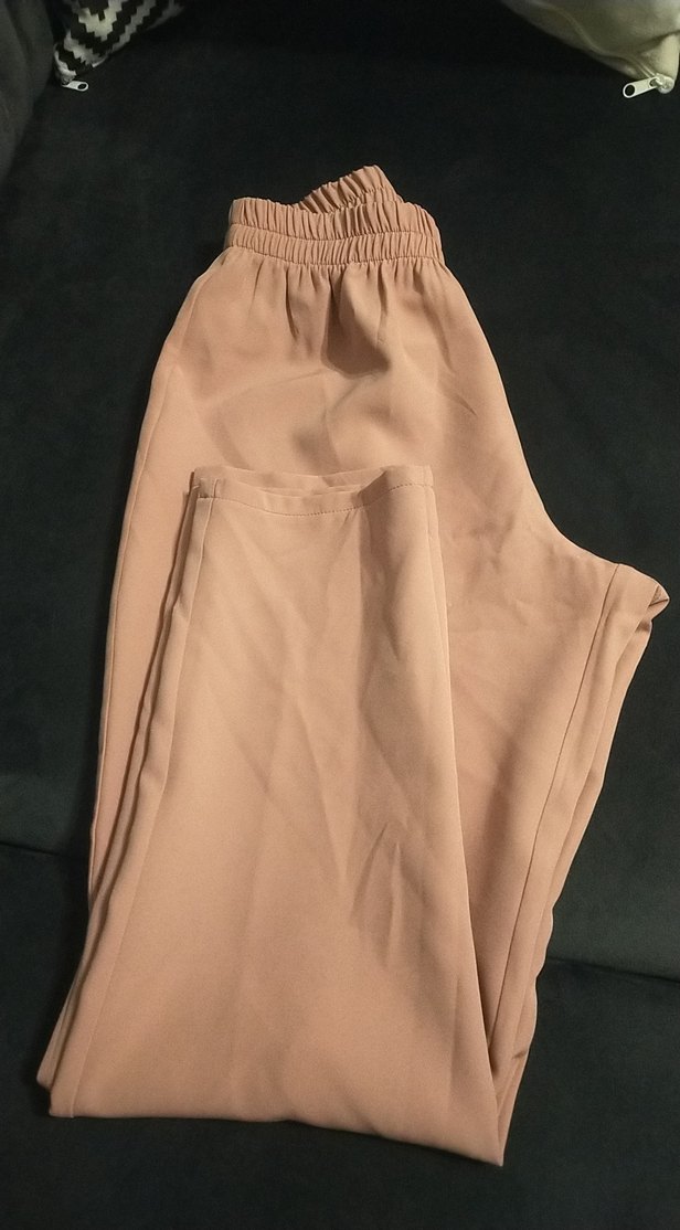Bej midi boy, rahat kesim kadın pantolon. Yumuşak sentetik kumaştan, desensiz, minimal sokak stili için uygun.