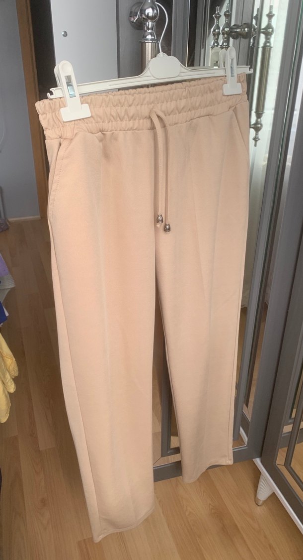 Bej renkte, rahat kesim midi kumaş pantolon. Elastik bel ve bağcık detaylı, günlük kullanıma uygun rahat bir sokak stili ürünü.