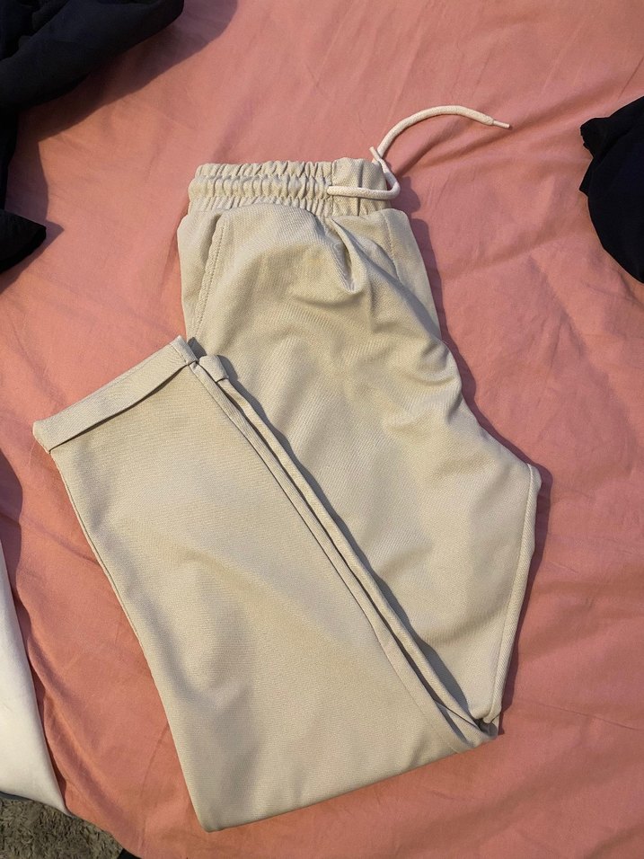 Bej renk, midi boy, bol kesim kadın pantolon, elastik bel ve bağcıklı. Yumuşak sentetik kumaştan, gündelik şıklık ve rahatlık sunar.