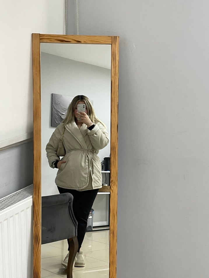 Bej renkli, şişme midi kadın mont, bol kesim ve yüksek yakaya sahip. Uzun kollu ve yumuşak, sıcak tutan kumaştan yapılmıştır, günlük kullanım için uygundur.