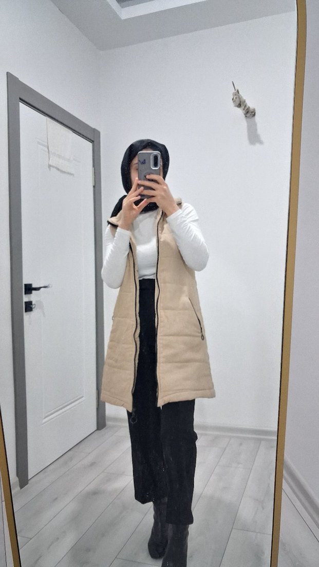 Bej renk, midi boy, kolsuz şişme yelek. Yüksek yakalı ve regular fit kesim. Günlük ve şık sokak stili için uygundur.