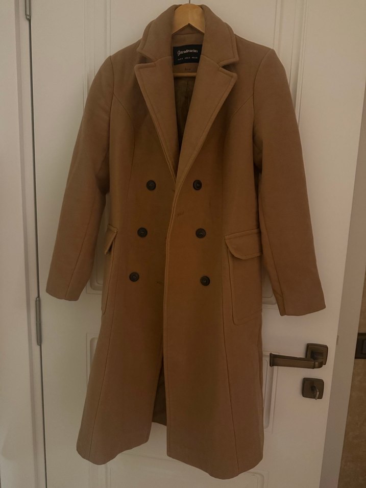Bej renkte, düğmeli, süet kumaştan midi uzunlukta kadın kaban. Normal kesim, uzun kollu ve kesik yakalıdır.